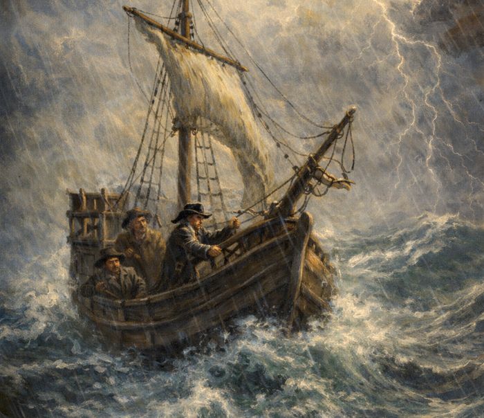 They drift with the ice that in a storm towers like a mountain. Sometimes they hook into an iceberg to slow down the drift. The rudder breaks. The ship’s boat breaks down but is found after a few days. The ship’s dog chased a polar bear and disappeared. It takes a month for the Lamprell to cross Hudson Bay, the last stretch of hard frost. They have to work hard in the storms to lower and hoist the sails.