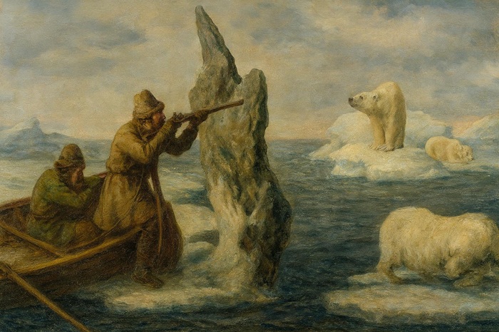 After a couple of days of snowstorm, they discover a polar bear feasting on the remains of a Beluga whale that he had caught. (The bears usually migrate here from their summer stay in the tundra to hunt seals out on the ice.) The bear is shot and cooked into a tasty meal.