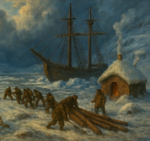 September 25: At high tide, they manage to get the ships up on land, reasonably protected. The following days are spent building dikes around them with timber and mud. The ice is getting in and the Unicorn is leaking. They are forced to move the boat and start over.