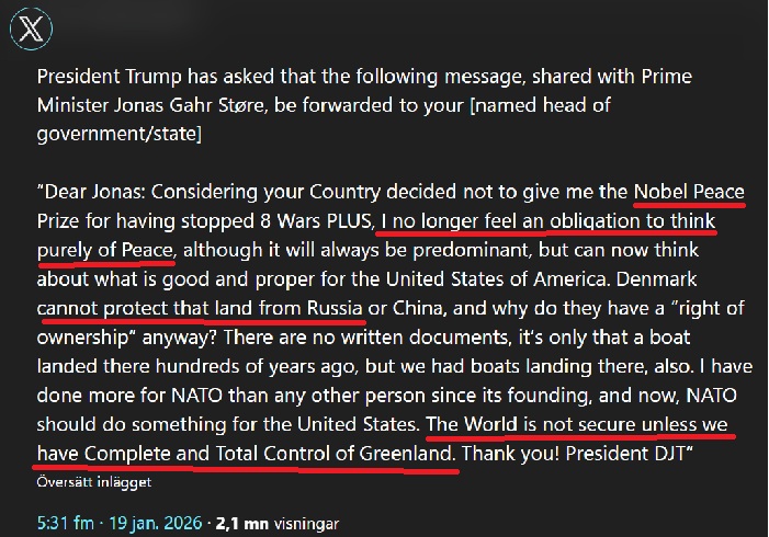 The world realizes that Trump means what he says. The letter early on the morning of January 19 to Norwegian Prime Minister Störe reveals the president’s mental health. A peace prize that brings war? A grandiose self-image that weighs heavily if you want to understand American politics.