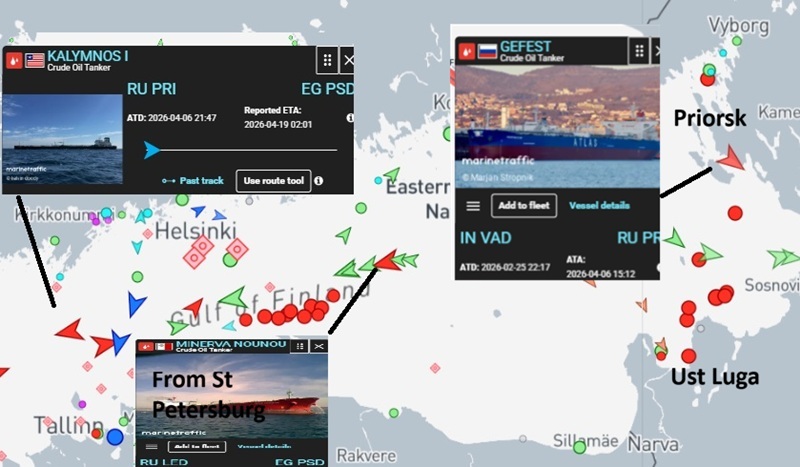 | Unidentified tankers | Anchored | 1–7 april | MarineTraffic shows a buildup of waiting ships in the eastern Gulf of Finland that cannot be brought into berth due to the security situation following the attacks on April 5. |