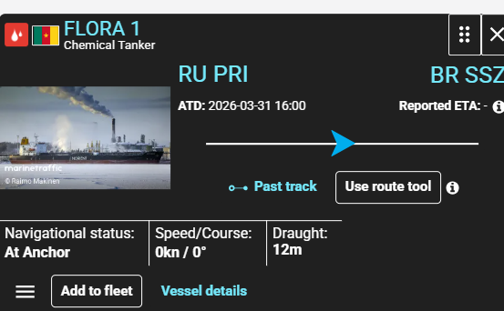 - March 14, 2026 : Flora 1 arrives in Primorsk (or anchorage outside).