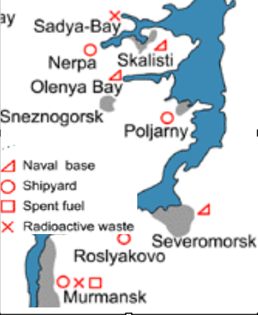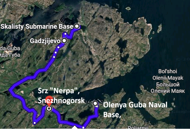 A sixty-mile and an hour drive from Murmansk brings you to a submarine cluster at the Olenya and Sadya bays. The three bases are Gadzhiyevo, Olenya, along with the Nerpa shipyard in Sneznogorsk.