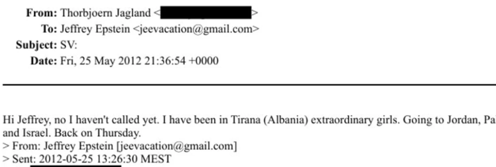 - Thorbjorn Jagland: < JE files + Jagland > Aftermath (2020 and beyond):s forced to resign as head of IPI after details of the loan and donations become public. Documents from trials (including Giuffre vs. Maxwell) continue to shed light on the roles of the visitors.